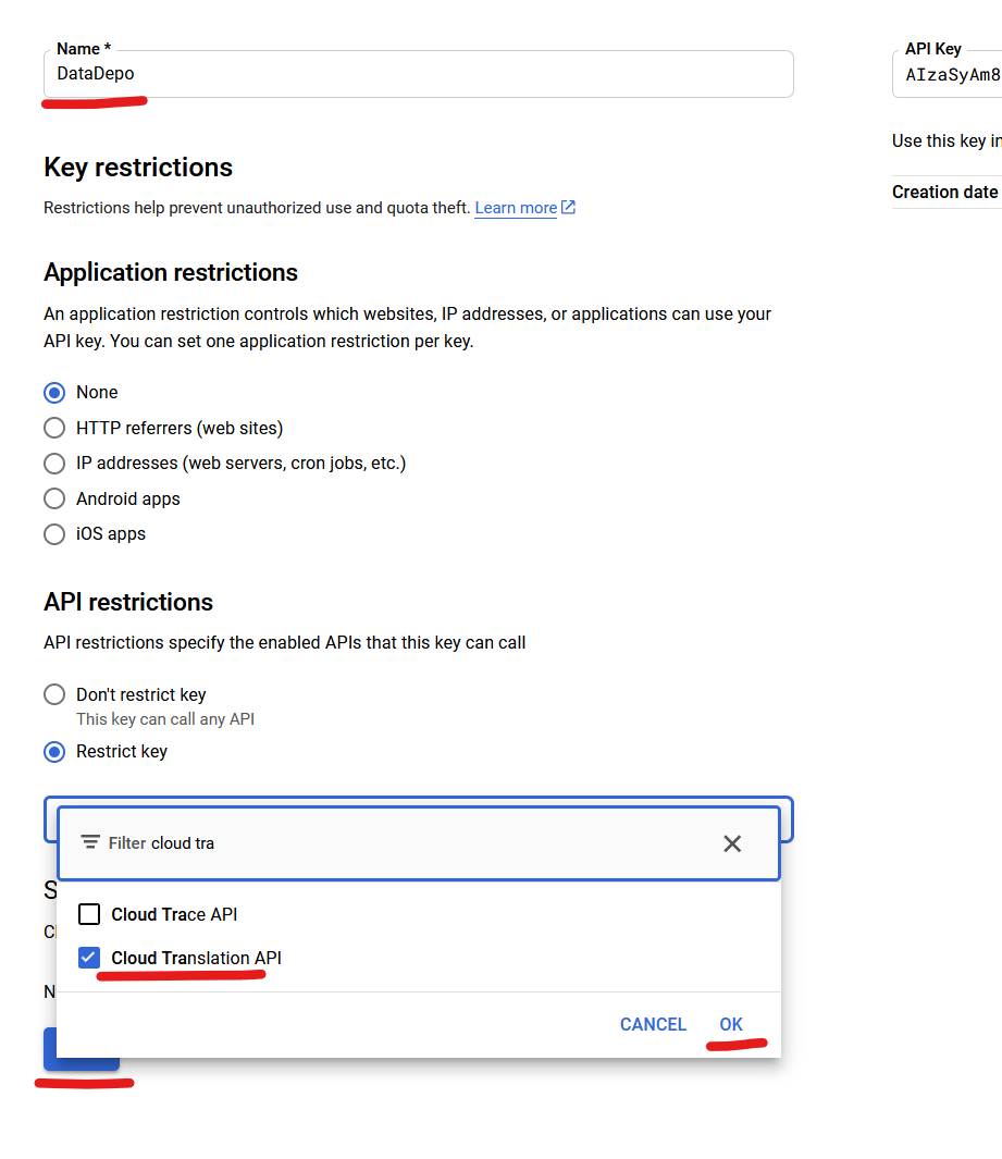 V sekci API restrictions zvolte Restrict key a vyhledejte Cloud Translation API