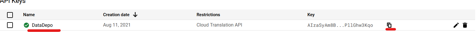 Vložte API klíč v DataDepu v Nastavení > Nastavení projektu do kolonky Google cloud translation API klíč