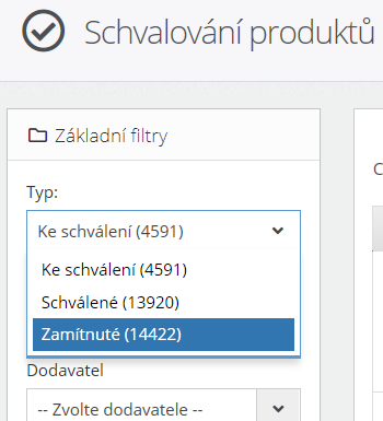Produkty lze v procesu schvalování schválit nebo zamítnout. Pokud produkt schválíte, stane se z něj aktivní schválený produkt připravený pro import na e-shop. V případě zamítnutí produkt zmizí z hlavní fronty a na e-shop se nenaimportuje. K zamítnutým produktům se můžete opětovně vrátit přes filtr Typ: zamítnuté a kdykoliv jej v budoucnu schválit. Nemusíte se tak bát, že o zamítnutý produkt přijdete.