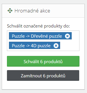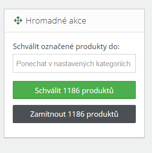 Při hromadném schvalování máte možnost vybrat i kategorii, do které se produkty schválí. Pokud tak učiníte, budou všechny produkty schváleny do vámi vybrané kategorie (nebo kategorií). Aktuální kategorie u všech schválených produktů budou nahrazeny nově vybranými.