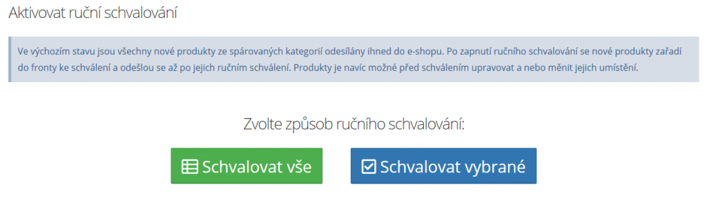Při vypnutém ručním schvalování jsou produkty schvalovány automaticky. Pokud dodavatel přidá produkt do již spárované kategorie tak je takový produkt automaticky ihned zařazen k importu na e-shop dle nastaveného schéma v párování kategorií. Díky zapnutému ručnímu schvalování můžete mít plnou kontrolu nad produkty, které jsou importovány na váš e-shop.
