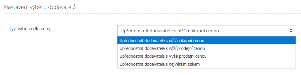 DataDepo se vždy pokouší vybrat co nejvýhodnějšího dodavatele, od kterého se má produkt odebrat. Primárně se DataDepo rozhoduje podle dostupnosti, sekundárně podle cen. Rozhodování podle ceny je možné ovlivnit přes Nastavení > Nastavení projektu v sekci Nastavení výběru dodavatelů.